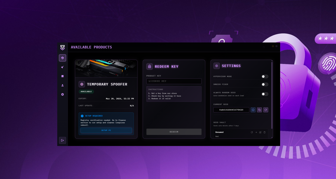 ✓Seeding system — Generates randomized identifier values for spoofed components.